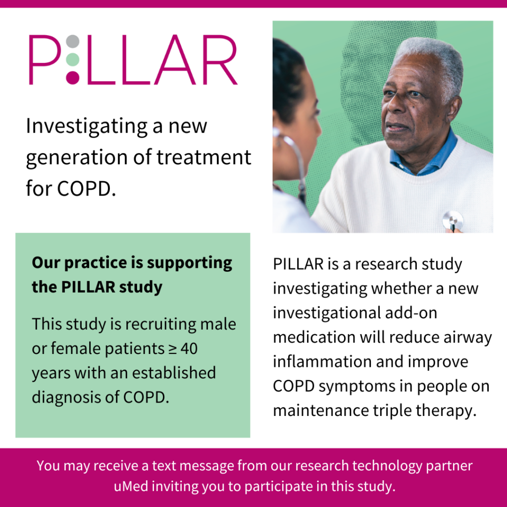 We are taking part in the PILLAR study which aims to understand whether a new investigational add-on medication will reduce airway inflammation and improve COPD symptoms in people on maintenance triple therapy.